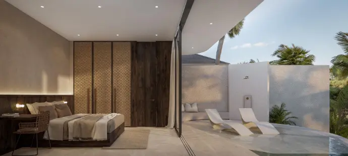 Chaque villa comprend deux chambres avec salle de bain privative, chacune dotée de grandes fenêtres ouvrant sur des jardins luxuriants, offrant une expérience sereine et proche de la nature.