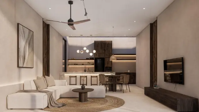 Les atouts principaux incluent de hauts plafonds avec éclairages design, de grandes baies vitrées avec orientation vers le coucher du soleil et une piscine à débordement inspirée de la plage ainsi qu'une parking dédié.