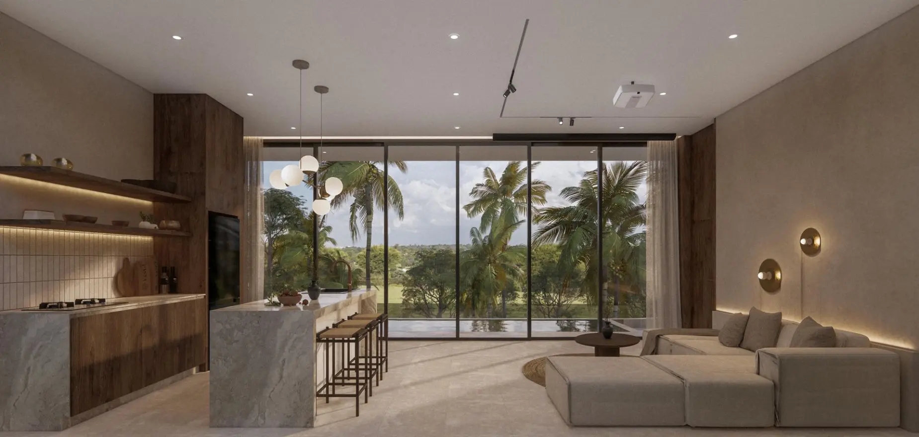 Parmi ses autres caractéristiques : de hauts plafonds avec éclairages design, un stationnement privé, une orientation plein sud et d'une piscine à débordement inspirée de la plage de 22 m², cette villa est composée de deux espaces extérieurs, l'un pour le coin repas et l'autre pour le lounge.