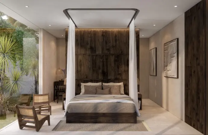 Conçue dans un élégant style Japandi, la villa présente une palette de couleurs apaisantes, de la pierre naturelle, du bois foncé et des finitions haut de gamme. Le spacieux salon est équipé d'un rétroprojecteur tandis que la cuisine est sur mesure avec un îlot central. La villa dispose de deux chambres avec salle de bain attenante, chacune équipée de grandes fenêtres donnant sur des jardins luxuriants, pour une expérience sereine, en pleine nature.