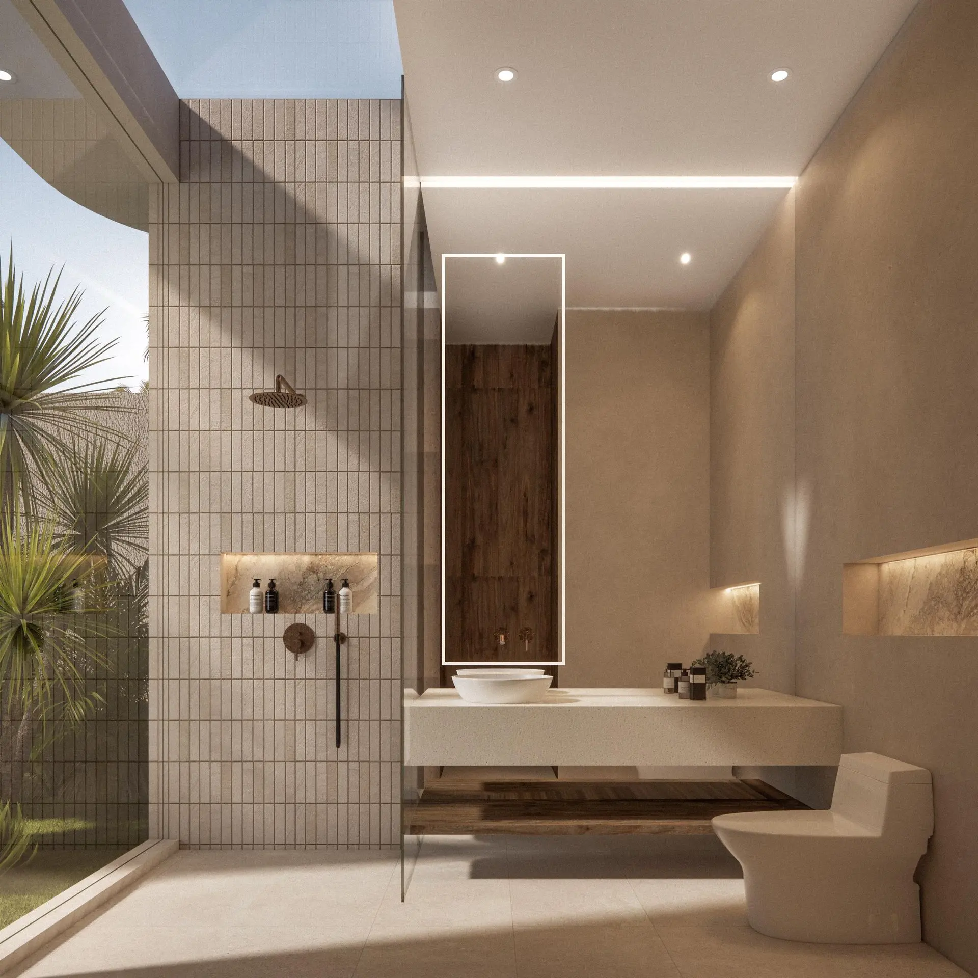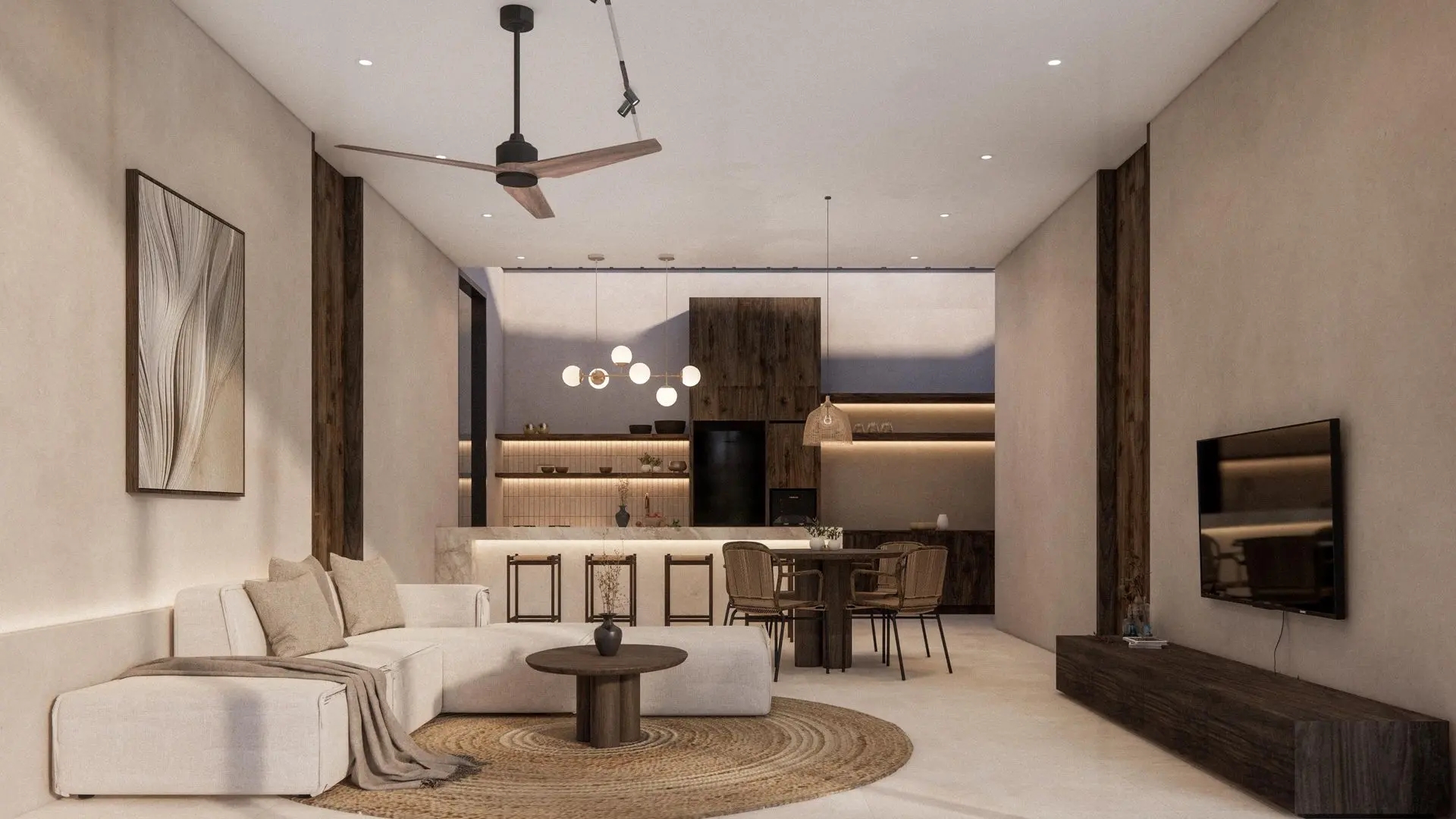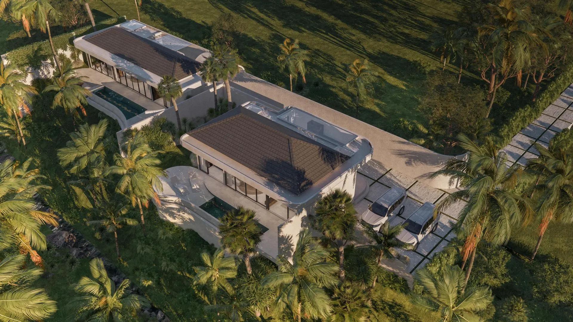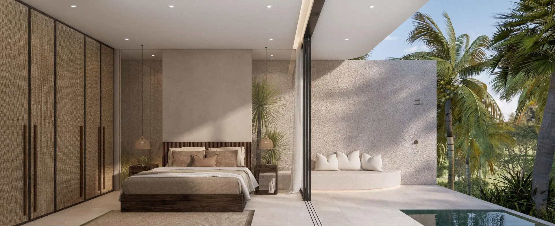 La villa est élégamment conçue dans un style Japandi, avec une palette de couleurs apaisantes, de pierres naturelles, du bois foncé et des finitions de qualité supérieure. Le grand salon comprend une cuisine sur mesure avec un îlot central. La propriété est composée de deux chambres avec salle de bain attenante, chacune équipée de grandes fenêtres donnant sur un jardin luxuriant, offrant une expérience paisible et connectée à la nature.